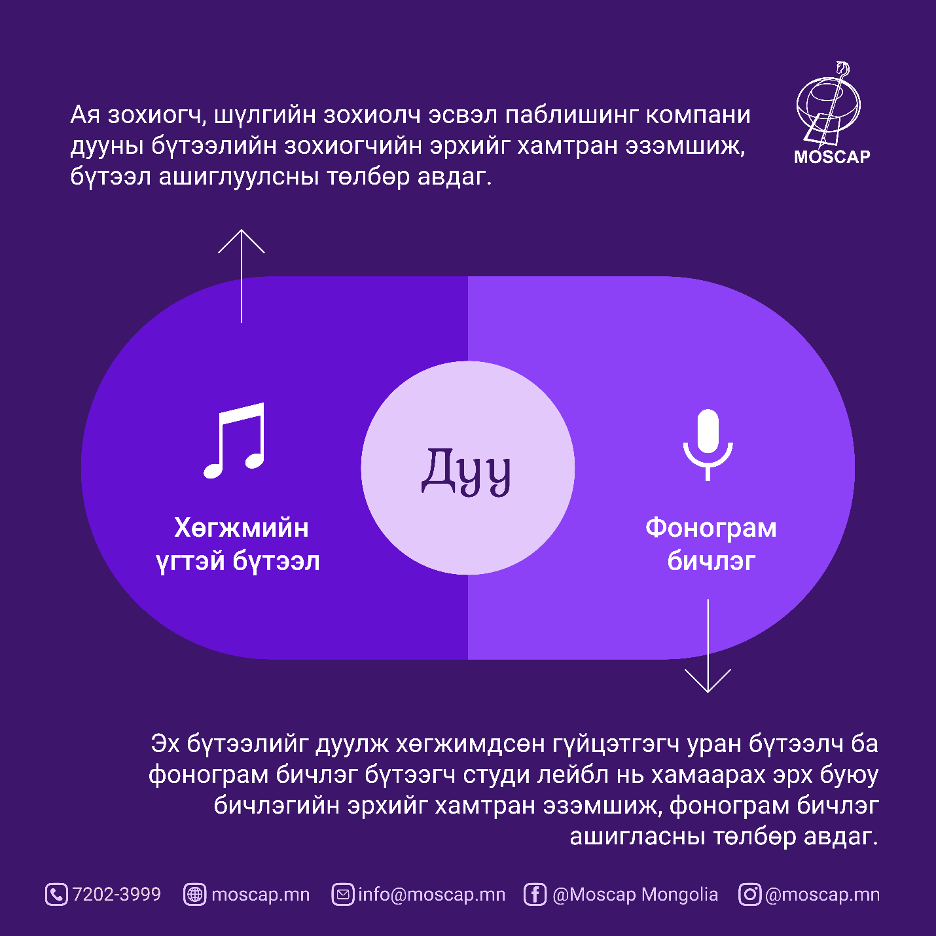 Оюуны өмчийг хүндэтгэх соёлыг хэрэглэгчдэд төлөвшүүлэх, хөгжмийн бүтээлийн үр шимийг зохиогчид оновчтой хүртэх нөхцөл боломжийг бүрдүүлэх манай үйл ажиллагааг дэмжиж, Хөгжмийн бүтээлийн зохиогчийн эрхийг эзэмшигч Та өөрийн бүх бүтээлийн дэлгэрэнгүй мэдээллээ дараах 2 линкээр болон info@moscap.mn хаягаар ирүүлэхийг хүсье.