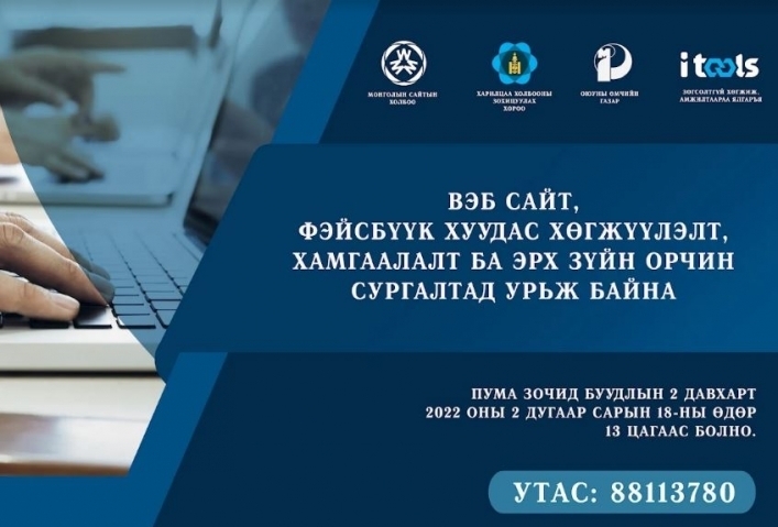 “Вэб сайт, фэйсбүүк хуудас хөгжүүлэлт, хамгаалалт ба эрх зүйн орчин” сэдэвт сургалтыг 2022 оны хоёрдугаар сарын 18-ны өдөр зохион байгуулагдах гэж байна