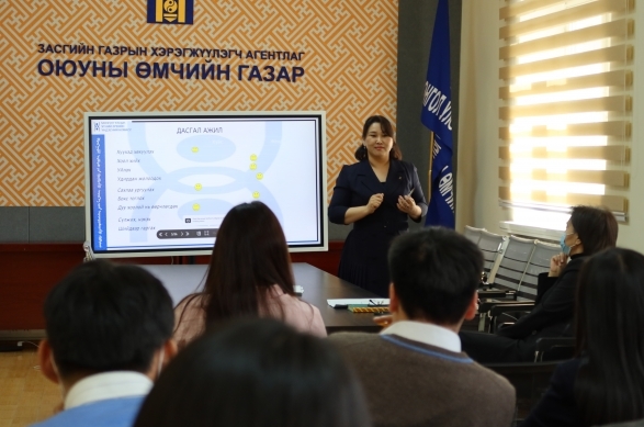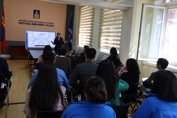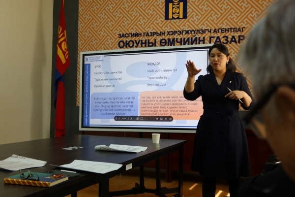 “Харилцан хүндэтгэе” аяны хүрээнд Оюуны өмчийн газрын нийт алба хаагчдад зориулан Монгол Улсын Хүний эрхийн Үндэсний Комиссын Хүний эрхийн боловсрол судалгааны хэлтсийн ахлах референт Х.Цэцгээ “Жендэр ба хүний эрх” сэдэвт сургалтыг зохион байгуулав. Сургалтад Оюуны өмчийн газрын 30 гаруй алба хаагч хамрагдаж, жендэр болон хүйсийн ойлголт, хүйсийн тэгш байдал, жендэрт холбогдох албан ёсны статистик мэдээг бодлого, шийдвэрт тусгах зэрэг асуудлаар ойлголт авч, санал солилцлоо.