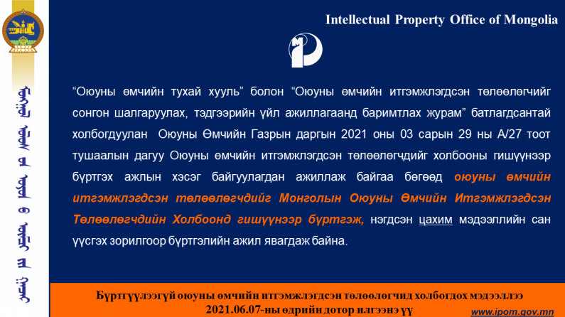 Оюуны өмчийн итгэмжлэгдсэн төлөөлөгчдийг Монголын Оюуны Өмчийн Итгэмжлэгдсэн Төлөөлөгчдийн Холбоонд гишүүнээр бүртгэх бүртгэлийн ажил явагдаж байна